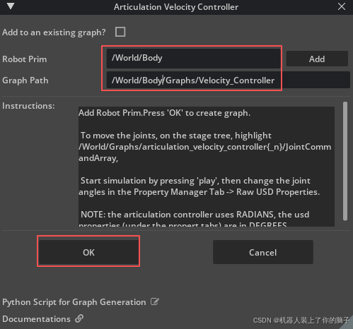 在Graph Path中填写/World/Body/Graphs/Velocity_Controller,以便将ActionGraph放置在上述的Graphs Scope中。