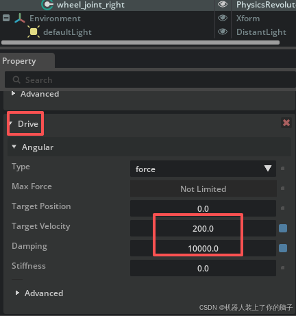 wheel_joint_left和wheel_joint_right),点击Property(属性) 面板中的+Add按钮,选择Physics > Angular Drive,即可同时为两个关节添加驱动。(2)控制模式设置