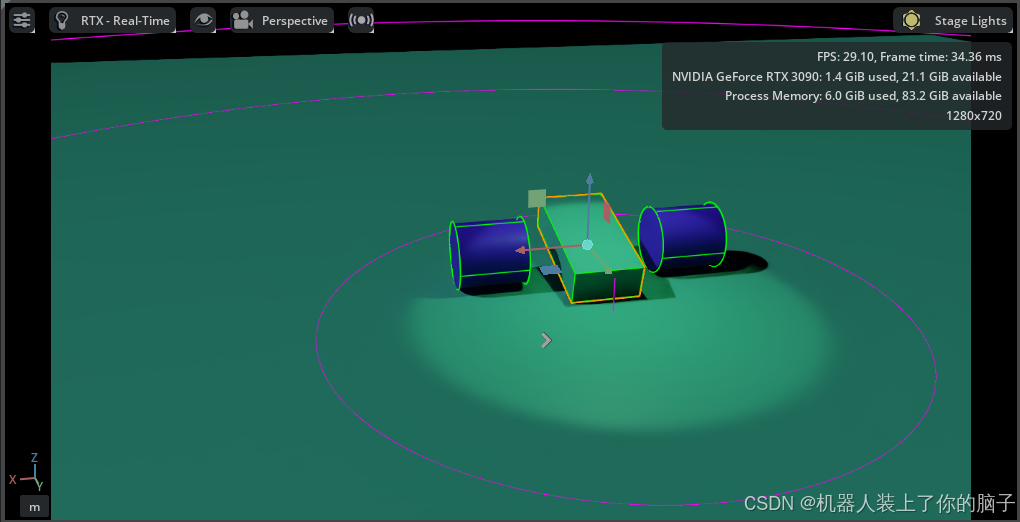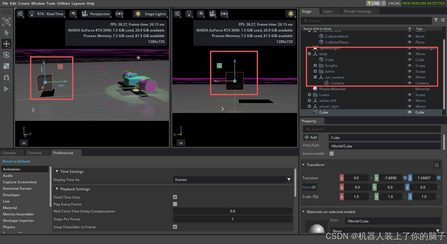 在显示车载相机的视口中,画面应能平分机器人车身和地面;同时在Perspective视口中确认相机相对于机器人的位置和朝向是否正确。