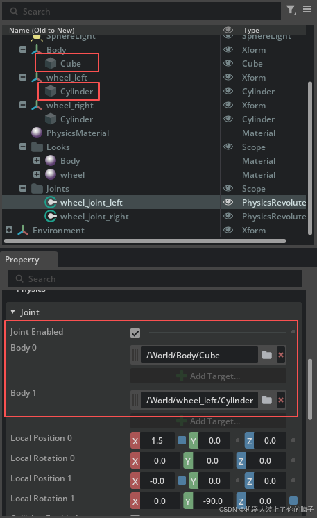 RevoluteJoint会出现在wheel_left下方,将其重命名为wheel_joint_left。(5)验证连接关系