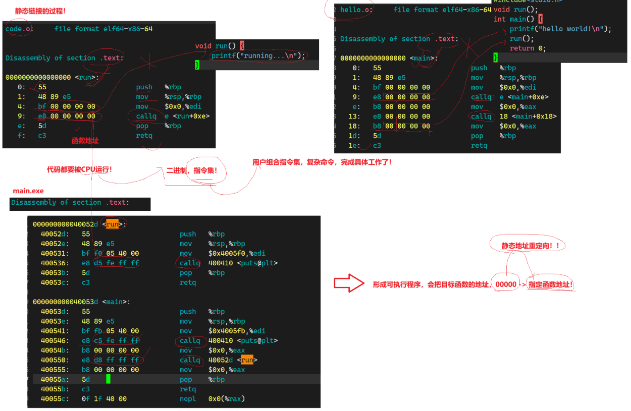 - 符号解析与重定位:链接器通过符号表(.symtab)找到未解析的符号(如 hello.o 中的 run 函数),修正其地址(指向 code.o 中 run 函数的实际位置)