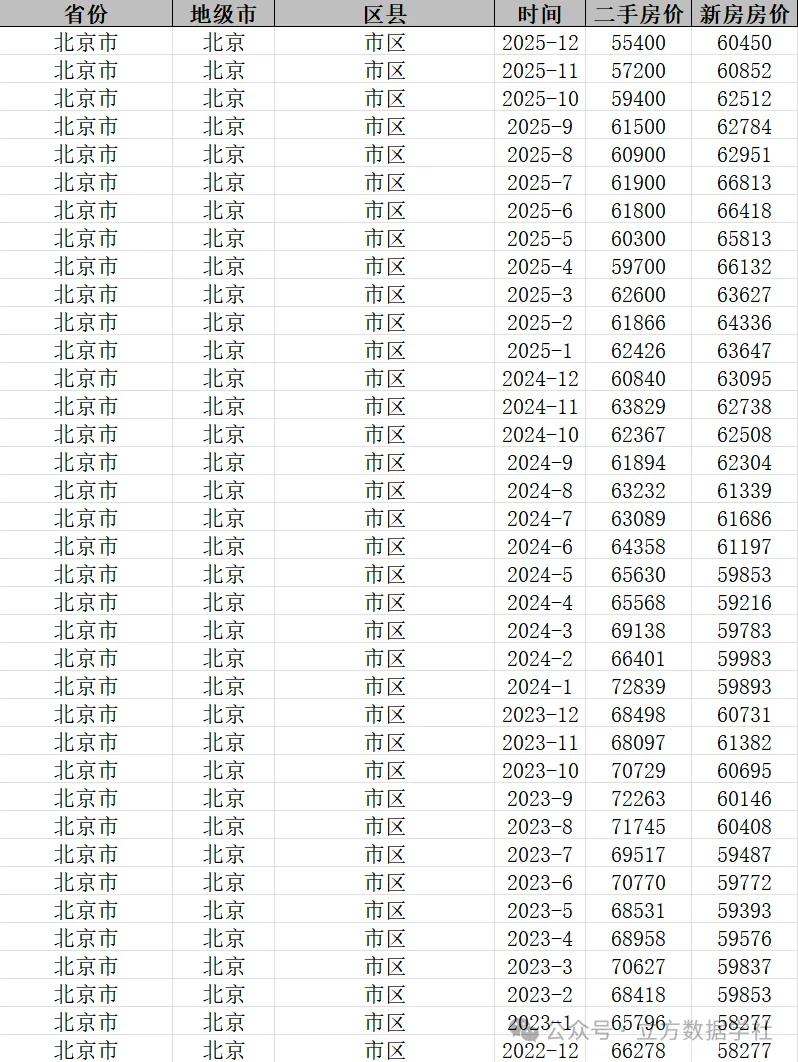 我们再来看一下Excel格式的数据,数据字段的具体属性与Shp格式相同,各区县2019-2025年逐月新房房价同样汇总为一个Excel文件。