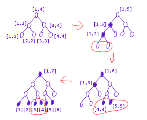 当区间长度为 2 x 2^x 2x 时,得到的线段树就是一个满二叉树。此外的区间长度都是在满二叉树的基础上,左、右子树的叶结点上按顺序添加子树。