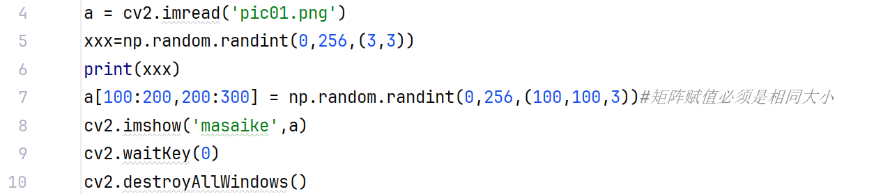 np.random.randint(0,256,(100,100,3)):生成与目标区域尺寸完全匹配的随机像素矩阵(100×100×3),赋值后该区域像素变为随机值,形成马赛克效果。