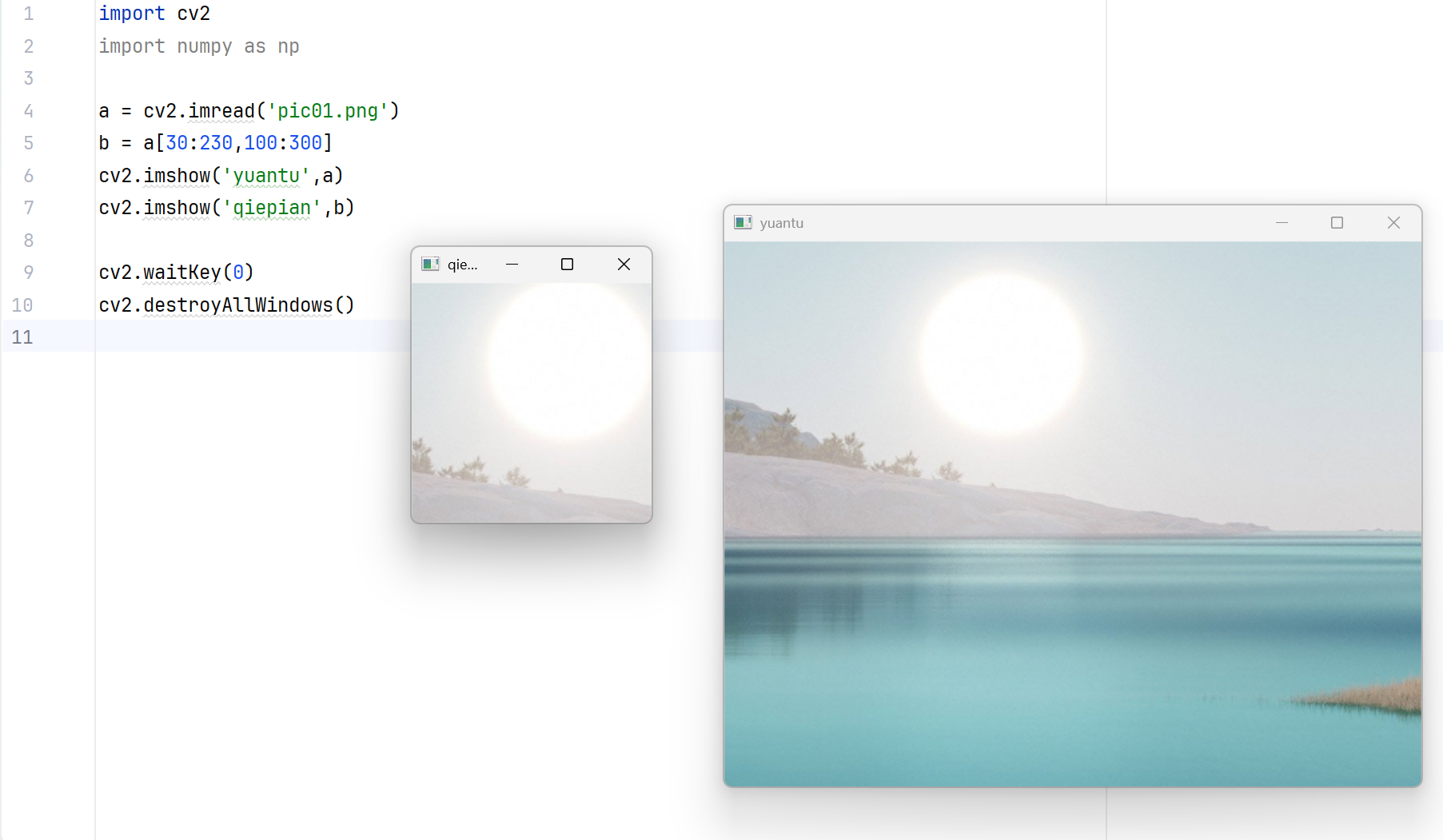 OpenCV 图像本质是 NumPy 数组,通过数组切片即可实现图像裁剪: