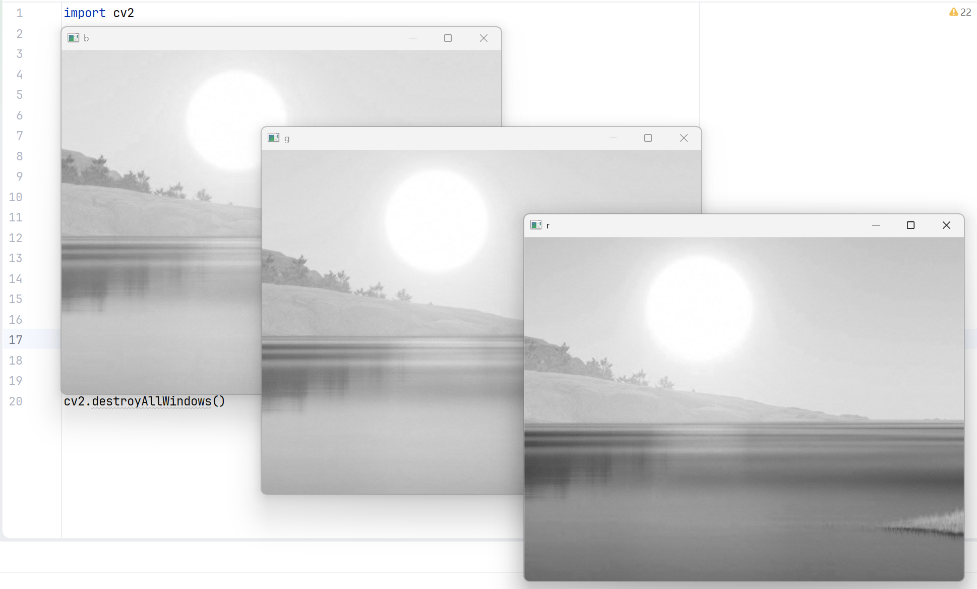 如下图是仅保留蓝色通道(将G、R通道置0),当然我们除了分离各个bgr通道,我们还可以将分离的通道合并img_merge = cv2.merge((b, g, r))将各分离的通道还原为原图。