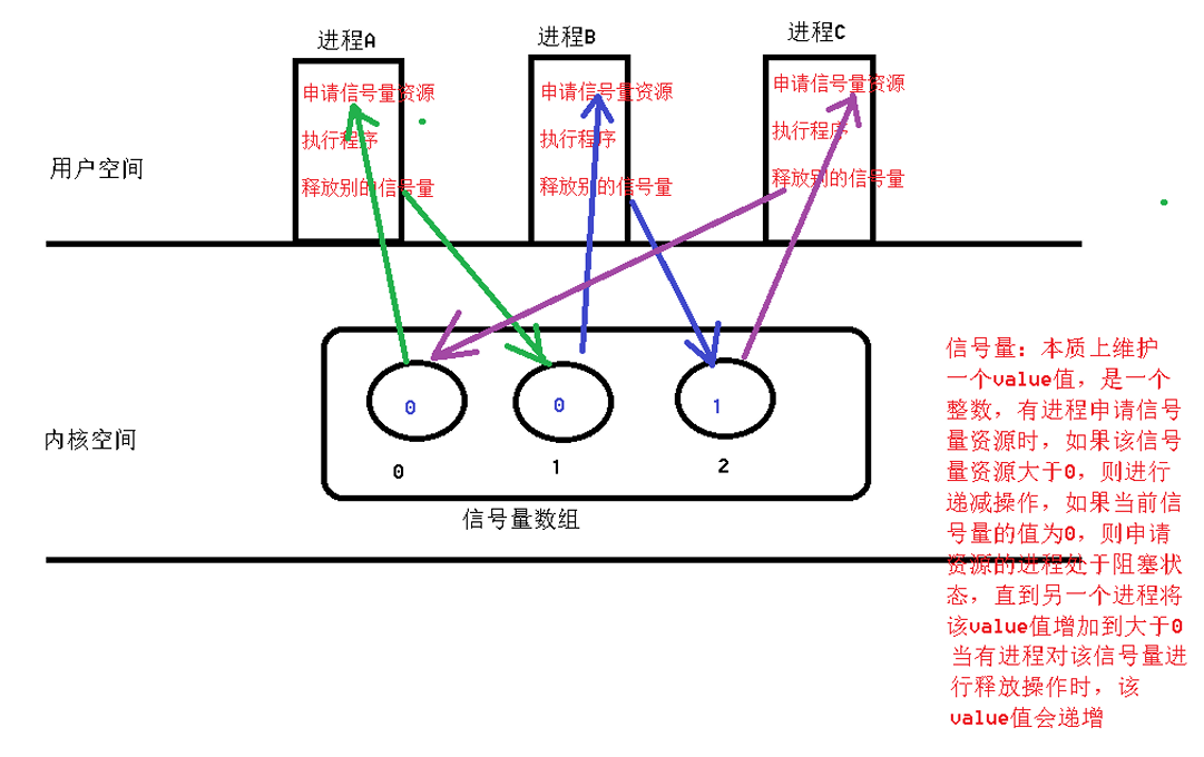 信号量集的使用,本质上是对多个value值进行管控,每个信号量控制一个进程,在进程执行 前,申请一个信号量的资源,执行后,释放另一个信号量的资源