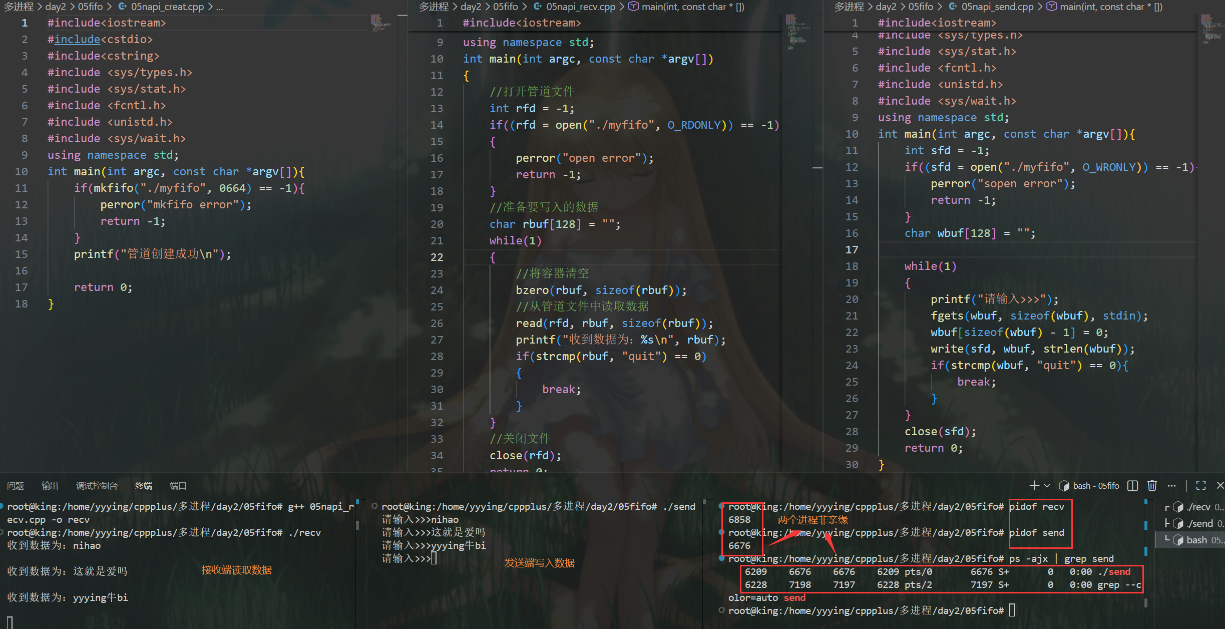 //也不可以在此创建管道文件,因为如果在此创建,那么父进程中和子进程中会分别创建一个无名管道