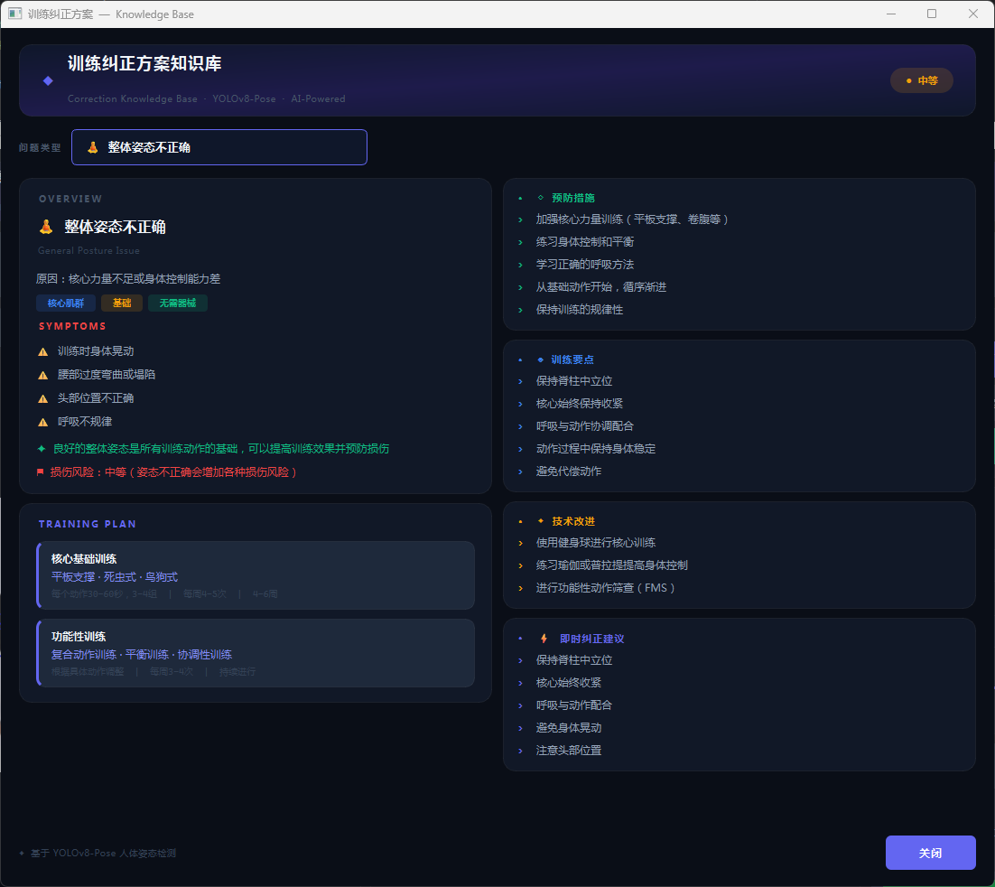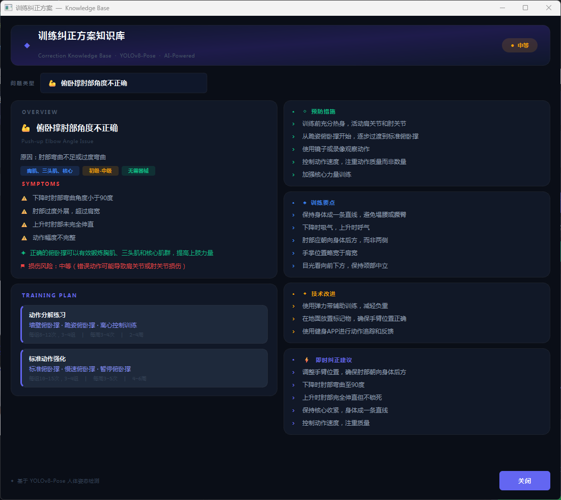 本系统内置专业纠正知识库,涵盖5种常见健身动作错误类型。用户点击"查看详细纠正方案"按钮,系统启动独立知识库窗口,以卡片式布局展示各类错误的详细信息。每个方案包含错误原因分析、典型症状描述、预防措施建议和具体纠正动作指导四个模块。知识库涵盖俯卧撑肘部角度不正确、深蹲膝盖角度问题、引体向上肩部姿态错误、侧平举肩部控制不当及通用身体姿态问题五大类别,每类标注严重程度并提供3-5条具体纠正建议和训练技巧,为用户提供系统化、专业化的动作纠正指导