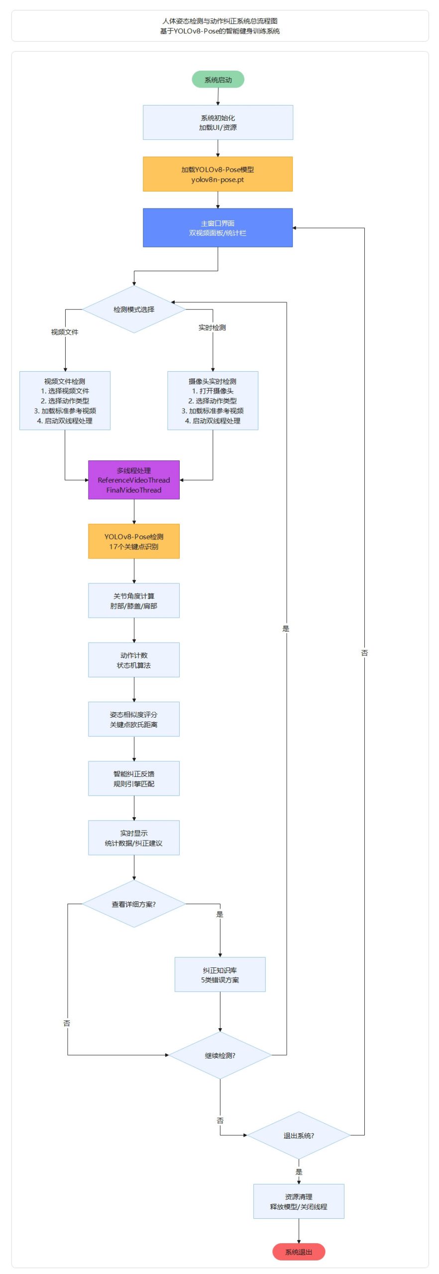 本系统采用Python 3.12开发,基于Ultralytics YOLOv8-Pose框架实现人体姿态检测,使用PySide6构建GUI,通过OpenCV处理图像视频,采用PIL渲染中文标签,利用多线程(Refe renceVideoThread、FinalVideoThread)保证流畅性和双视频同步。系统集成纠正知识库模块(correction_knowledge.py),建 立包含错误原因、症状、预防措施、纠正动作、训练方案的完整知识体系。核心算法模块包括PoseDetector(姿态检测)、Exerci seAnalyzer(动作分析)、PoseComparator(姿态对比)、Visualizer(可视化),实现17关键点检测、角度计算、动作计数、相 似度评分、智能纠正反馈,为健身与康复训练提供完整的智能检测与科学纠正解决方案。
