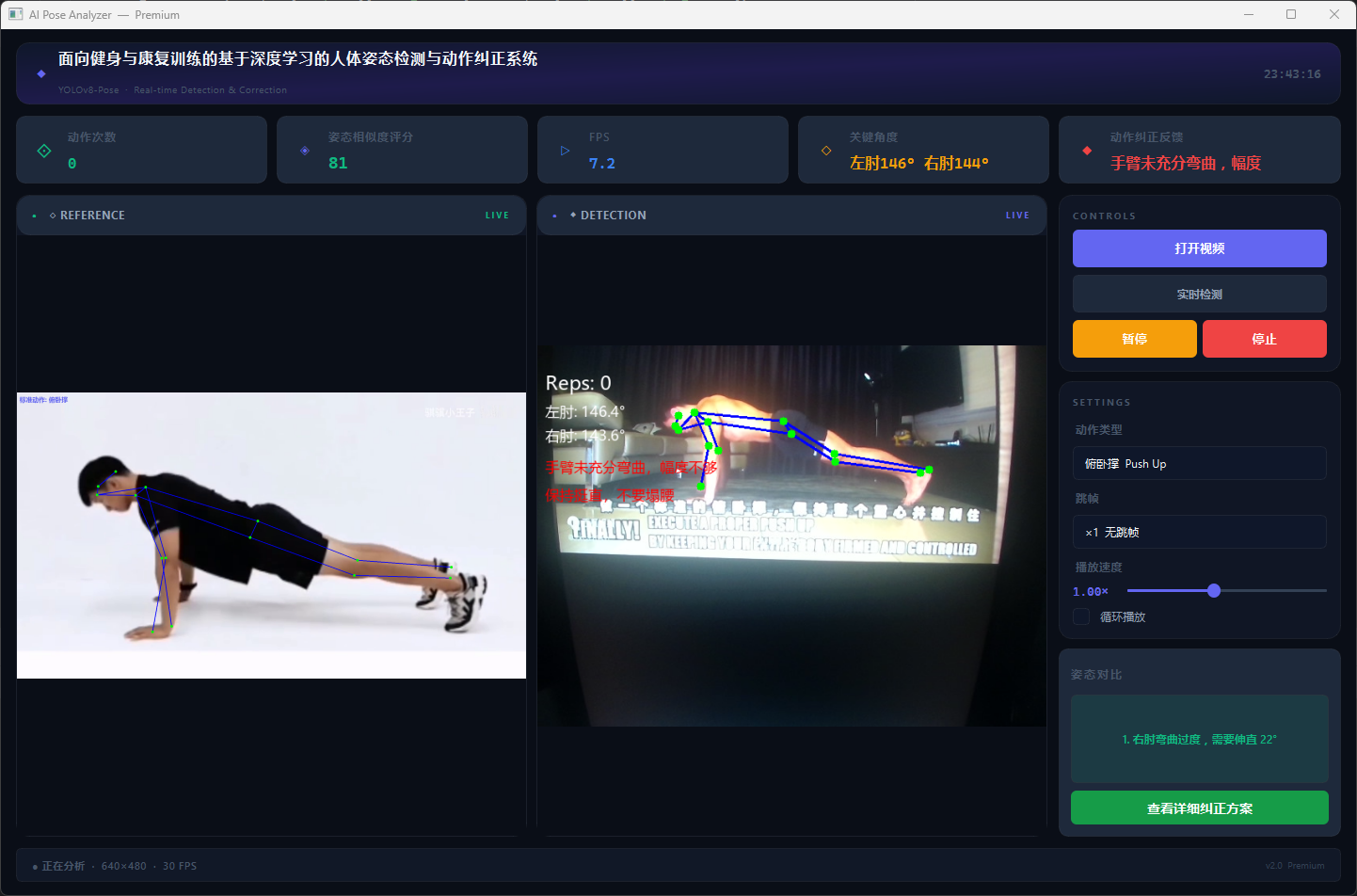 支持视频文件和摄像头实时检测,提供双视频同步对比、姿态相似度评分、关键角度显示、动作计数、智能纠正反馈及详细纠正方案查询功能。