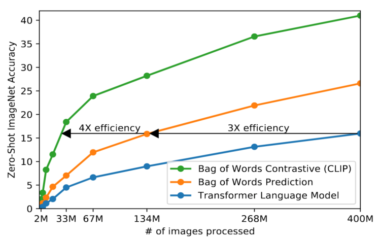 结论:Transformer语言模型的学习速度比预测文本的词袋( BOW )编码的基线慢3倍。将CLIP的预测目标替换为对比目标,又进一步提高了4x的效率。