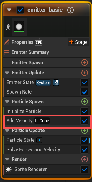 增加Add Velocity速度属性,在粒子生成组里,让白色的粒子可以动起来,并设置为锥形