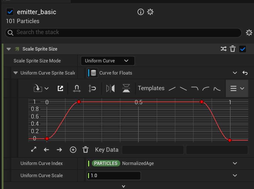 设置粒子从大变小的生命周期,在粒子更新组里,添加Scale Sprite size