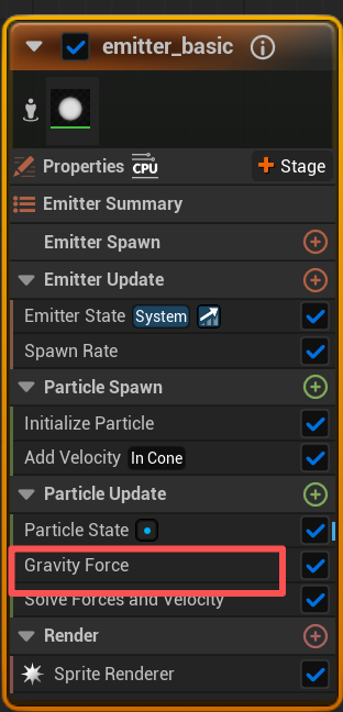 发射器的"生成模式"(持续生成/单次爆发/按周期生成等)。- Emitter Update(发射器更新)