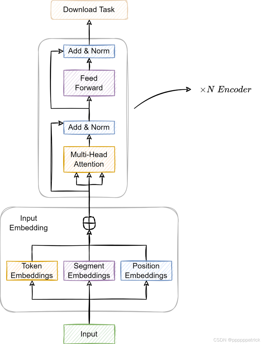 - Position Embedding:绝对位置编码,为每个位置(最多512个)分配768维向量,弥补Transformer无位置感知的缺陷;