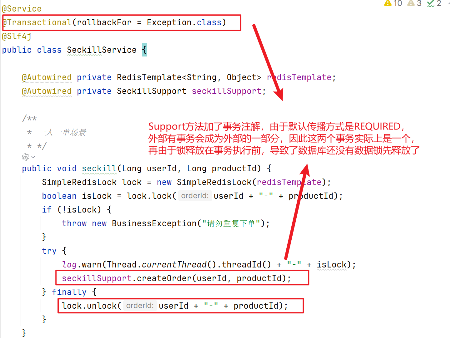 由于事务的传播机制影响,这里都是REQUIRED,seckillSupport外部有事务,所以加入外部事务成为其一部分,因此事务未提交锁先释放导致数据库中出现了两条重复数据