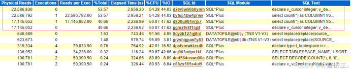 从上面可以看到buffer hit、soft parse、library hit的命中率明显很低,但经过查看buffer pool advisory,share pool advisory 等建议,确定数据库的各组件内存分配是足够的。因此可以判断是由于数据库访问一些不在内存中的数据,且跑了一些新的sql,进行了硬解析。