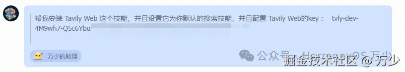 帮我安装 Tavily Web 这个技能,并且设置它为你默认的搜索技能,并且配置 Tavily Web 的 key: xxxxxxxxx
