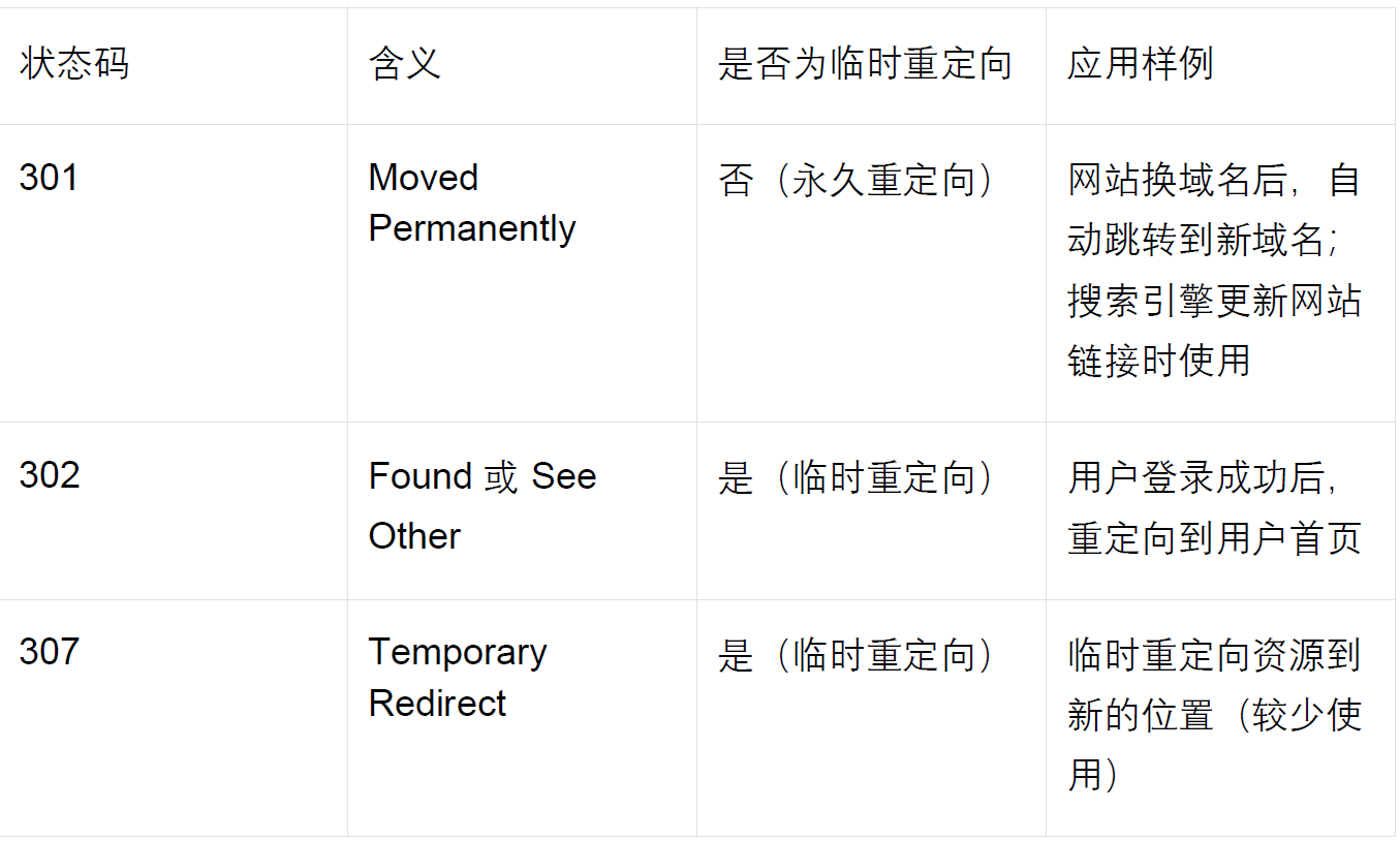HTTP 重定向状态码以 3 开头,它们都包含一个 Location 响应头,用来指明新的目标地址 。根据行为不同,主要分为永久重定向和临时重定向。