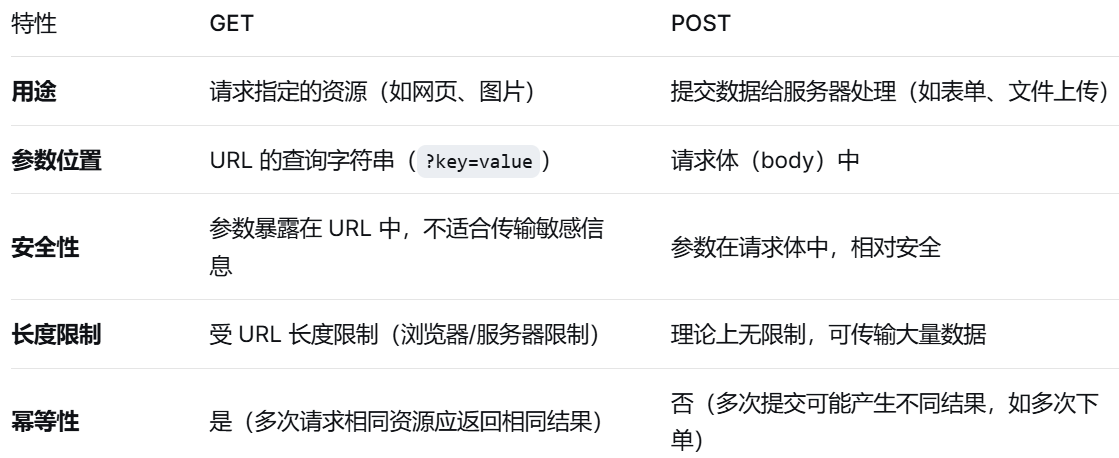 - 客户端-服务器模型:由客户端(如浏览器)发起请求,服务器响应。