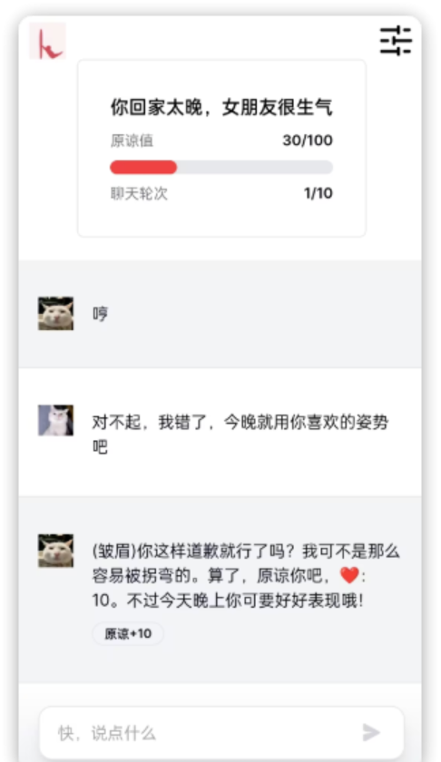 - 第一次用户会提供一个女友生气的理由,如果没有提供则直接随机生成一个理由,然后开始游戏