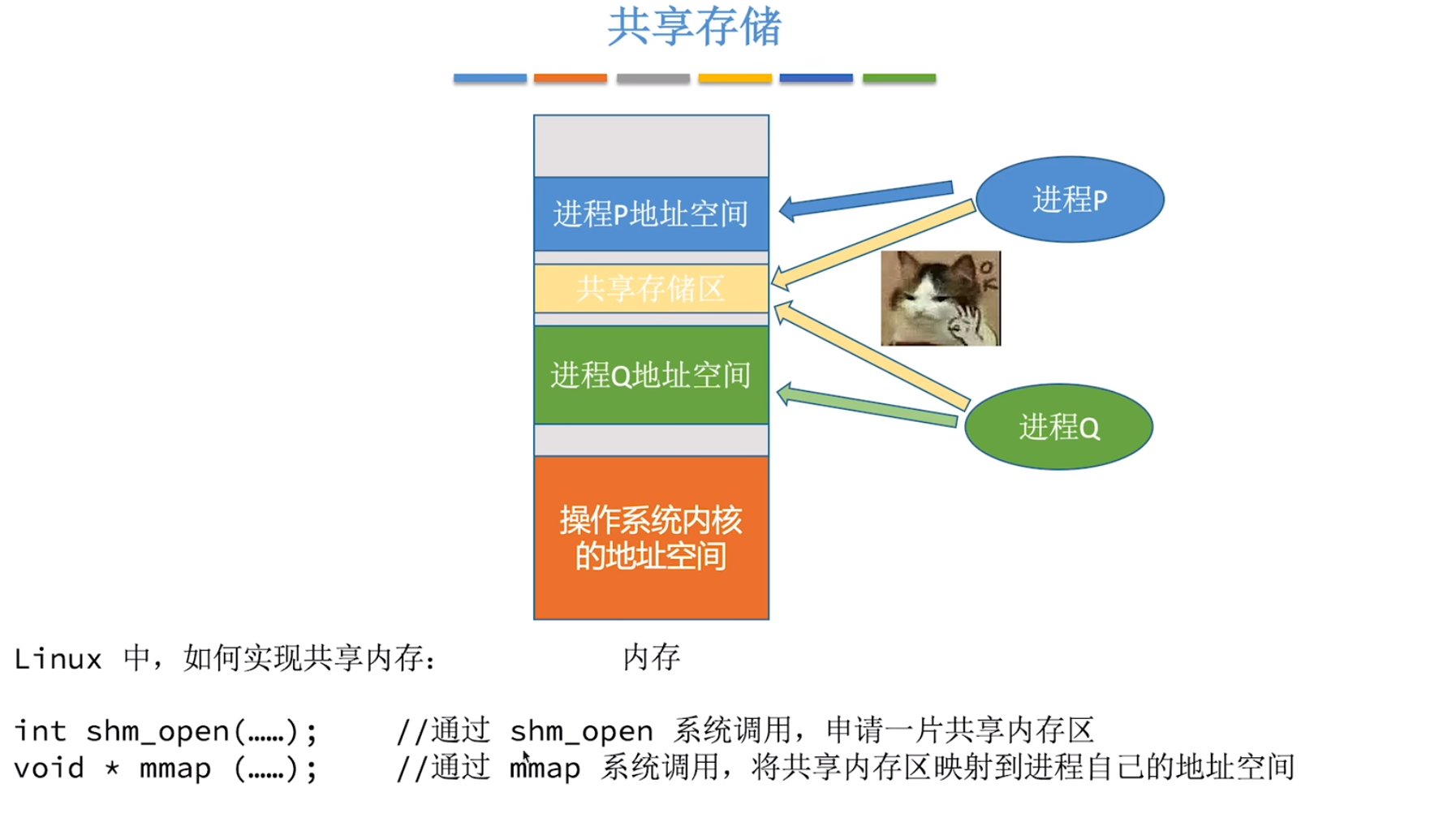 - 原理:将同一块物理内存映射到多个进程地址空间,零拷贝、直接读写。