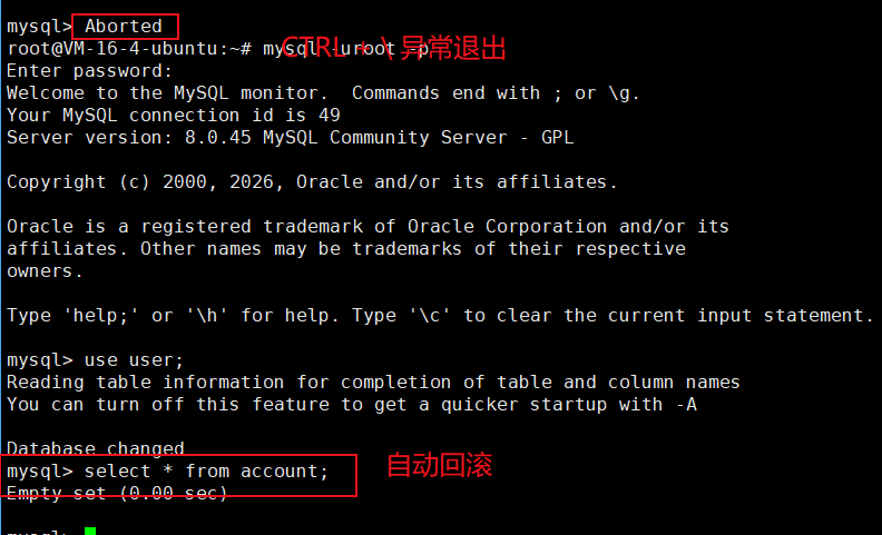注意:我们事务开启之后,一旦出现异常或者崩溃没有 commit 就会自动回滚;