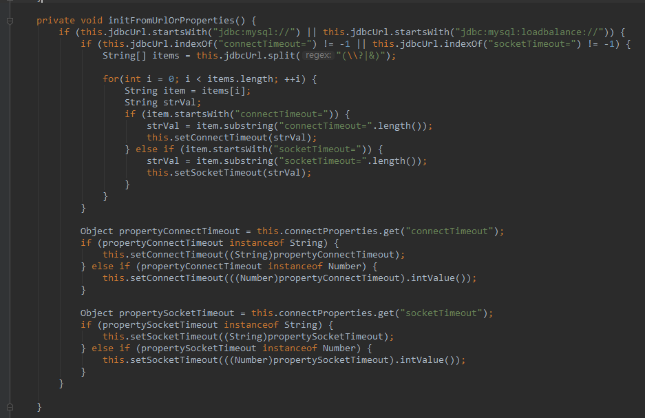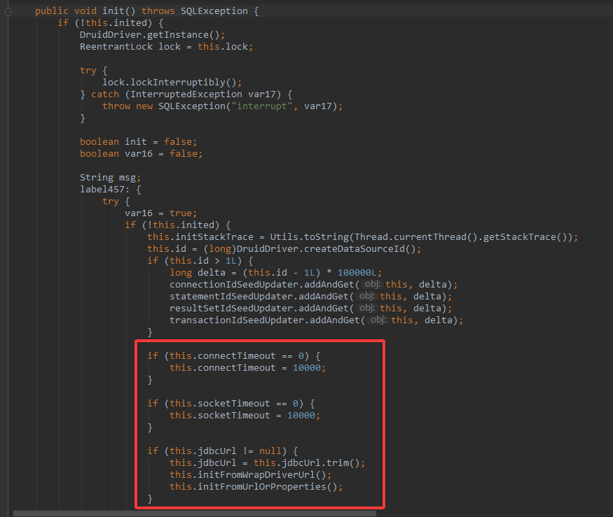 在init方法中,给connectTimeout和socketTimeout设置值的是红框的部分代码。由于DruidDataSourceCreator里没有调用DruidDataSource的setConnectTimeout和setSocketTimeout方法,所以connectTimeout和socketTimeout都是0。