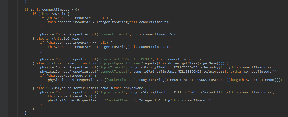 initFromUrlOrProperties方法中也会修改connectTimeout和socketTimeout的值,但是只对mysql有效。mysql类型的数据源会从jdbcurl中读取connectTimeout和socketTimeout参数,也会从connectProperties里读取connectTimeout和socketTimeout参数但是前提是,你是mysql!!!!!oracle他没做任何操作!!!!!