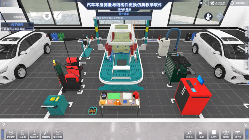 核心实训层(核心功能模块):系统的核心载体,包含车身测量与校正、车身结构件更换两大子模块,覆盖车身修复实训的核心内容。核心实现:还原实车操作全流程,支持任务快速跳转与自由切换,操作步骤标准化,每一步均有提示与正误判断,确保学生规范操作。