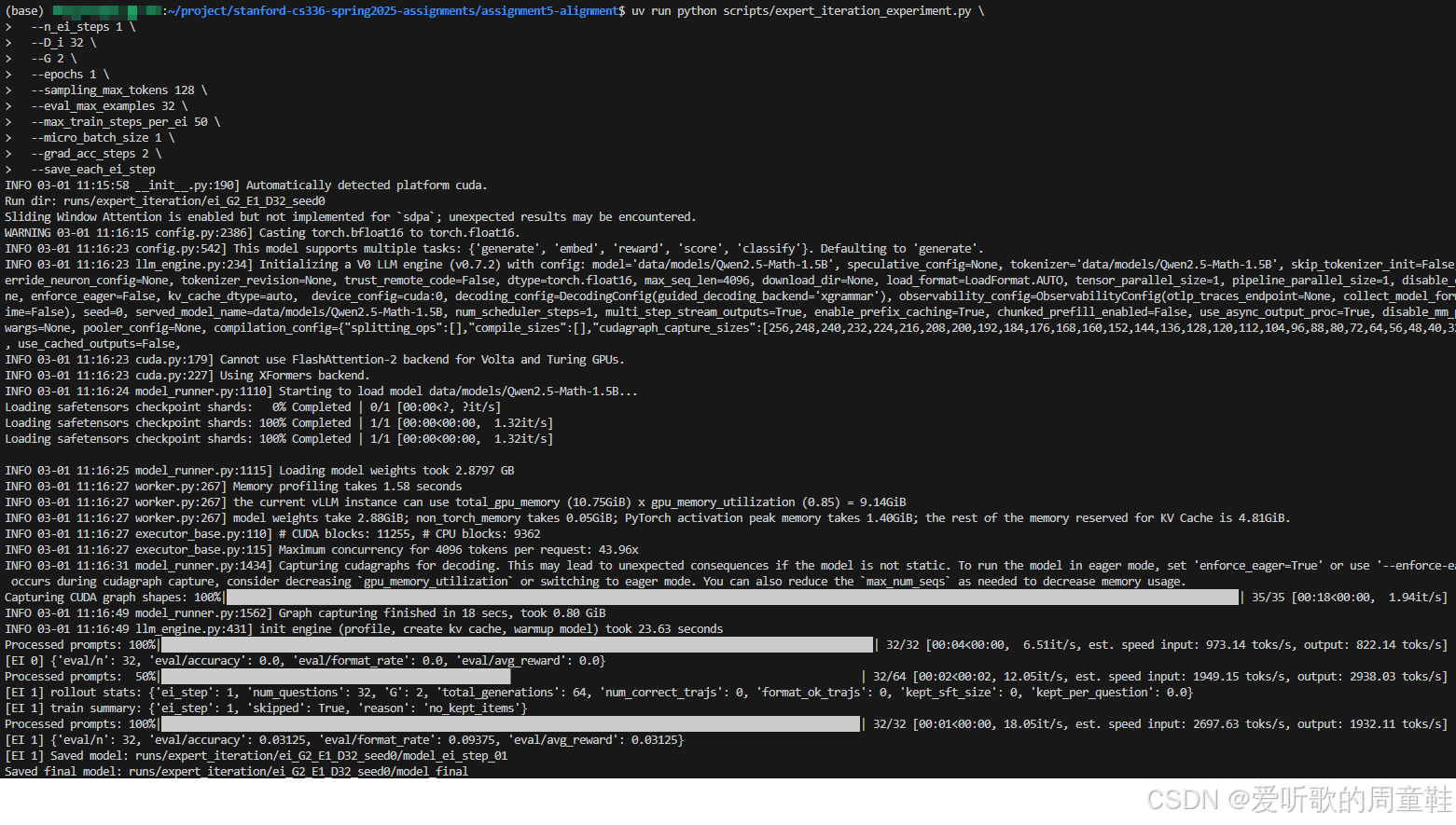 在本篇文章中,我们围绕 CS336 Assignment 5 中的 SFT 与 Expert Iteration 相关任务,系统完成了从零样本基线评估、推理型 SFT 训练到基于模型自生成数据的 EI 闭环优化的完整实现流程。