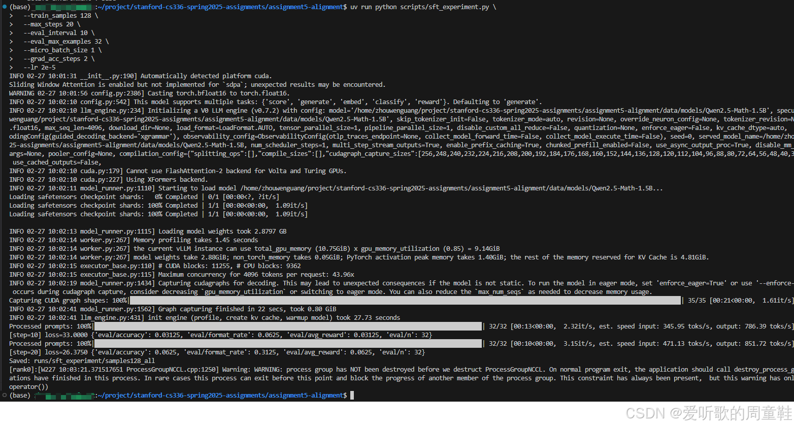 Note :由于硬件资源的限制,博主在本次实验中做了和 sft_experiment 相同的修改设置,这里就不再赘述了,博主仅仅是为了验证实验脚本的正确性,大家如果算力足够的话,可以正常执行实验。