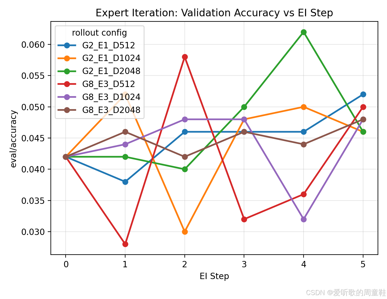 从上图我们可以看出,在当前资源受限设定下,EI 的验证准确率整体在 0.03~0.06 区间波动,没有出现稳定单调提升。波动主要来自 EI 过程的 "高方差数据生成":每步只保留极少数正确 rollout,导致每步 SFT 的有效训练数据规模很小,且不同 EI step 的训练样本分布差异很大。