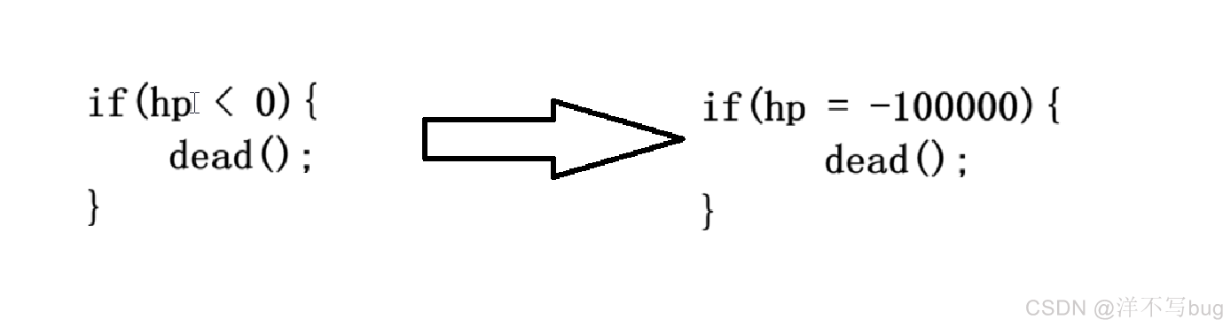这个一般有两种情况会这样做,一种是外挂,一种是病毒😅就拿做外挂而言,比如做PUBG的无敌锁血挂,大概就是分析出内存中的哪条指令在判定死亡,然后修改这条指令,让系统永远不会判定玩家被击杀(如下图,hp就是血量,这里只是简单举个例子,实际肯定不会这么简单)