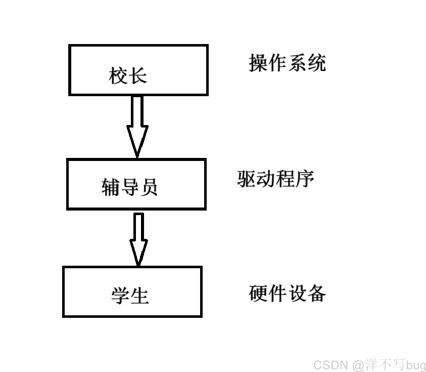 操作系统,驱动程序,硬件设备就类似于这样一个关系,校长并不熟悉每个班的同学,例如要开运动会,校长会先通知辅导员,辅导员再管理同学进行备赛组队(辅导员对同学是比较了解的),如下图所示: