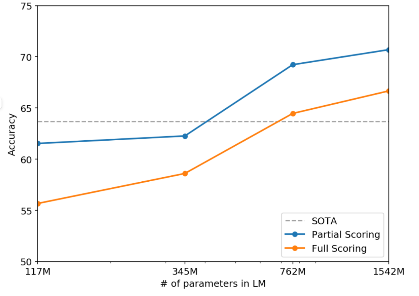 Winograd模式挑战(Levesque等人,2012)旨在通过评估系统化解文本歧义的能力,衡量其进行常识推理的水平。最近,Trinh与Le(2018)利用语言模型在此挑战上取得了显著进展,其方法是通过更高概率预测歧义的消解方案。我们遵循他们的问题构建方式,并在图3中以完整与部分两种评分技术可视化了我们模型的性能。GPT-2将当前最优准确率提升了7%,达到70.70%。由于该数据集规模较小(仅含273个样例),我们建议参阅Trichelair等人(2018)的研究以帮助理解这一结果。
