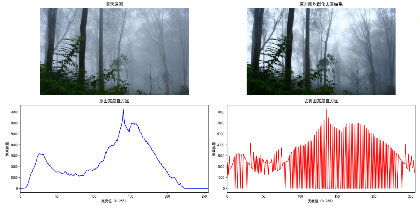 cv2.calcHist()分别计算原图与去雾图的亮度直方图,将抽象的去雾效果转化为直观的数值分布对比,清晰呈现亮度动态范围的扩展。 - 四视图可视化:采用2×2子图布局,同步展示「雾天原图、去雾结果、原图直方图、去雾直方图」,实现"视觉效果"与"数据分布"的双重验证,完美匹配实验分析场景。