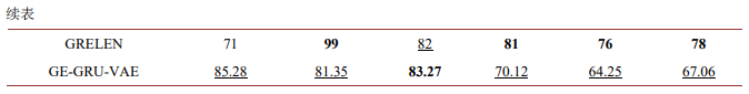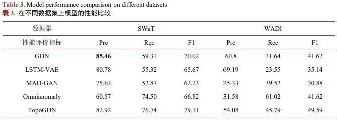 由表3可知,首先,在SWaT和WADI两个数据集上,基线模型包括LSTM-VAE、MAD-GAN、Omni Anomaly和Topo GDN的三个性能指标的值都比较小,说明这些模型性能较差。其次,在SWaT数据集上,与其他基线模型相比较,GE-GRU-VAE的F1值最高,其精确率Precision和召回率Recall排在次优位置,精确率和召回率最高的模型分别是GDN和GRELEN。在WADI数据集上,GRELEN的三个性能最大,说明该模型在该数据集上性能最优,GE-GRU-VAE在该数据集上的三个性能指标都是次优。虽然在WADI数据集上,本文提出的GE-GRU-VAE是次优模型,但是与最优模型GRELEN的较高时间和空间复杂度相比较,GE-GRU-VAE仍属于性能优良的异常检测模型。最后,结合模型在两个数据集检测精度的性能指标值和复杂度指标值,可知本文提出的模型GE-GRU-VAE对多维时间序列异常检测具有一定优势。