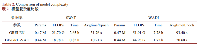 由表2可知,在SWaT和WADI两个数据集上,本文提出的模型GE-GRU-VAE的复杂度的各个指标值均明显低于GRELEN模型的值,尤其是刻画时间复杂度的指标time和Avgtime/epoch下降最明显。该结果表明模型GE-GRU-VAE在时间和空间复杂度上均优于模型GRELEN。