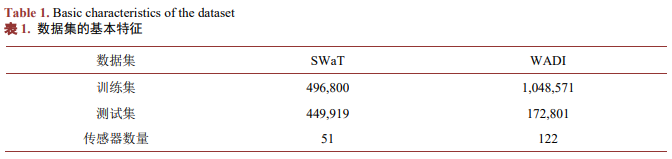本文采用两个真实数据集验证模型有效性,数据集SWaT (Secure Water Treatment) 和WADI (Water Distribution Testbed) 由新加坡科技设计大学的iTrust机构采集并开源。数据集的基本特征如表1所示。两个数据集的训练集只包含正常数据,测试数据集则包含正常和异常两种状态的数据。本文将训练集分为训练数据(80%)和验证数据(20%),其中训练数据用于模型训练,验证数据用于模型选择,测试数据集用于检验模型有效性。