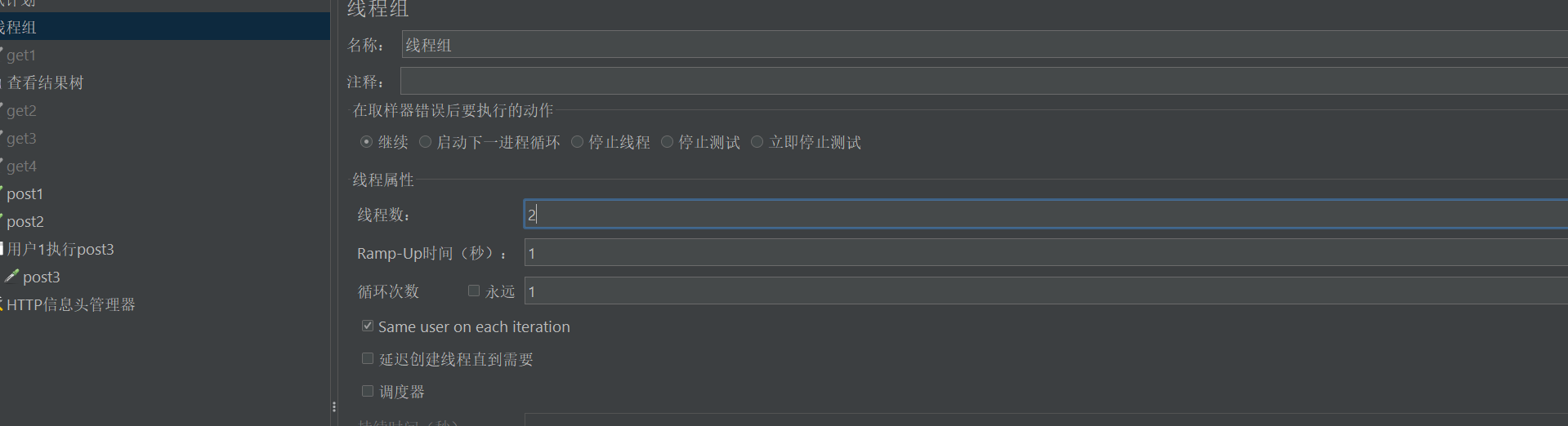 - 验证方法:在查看结果树中可以看到每个用户执行的请求记录,如2个用户会分别执行post1、post2、post3请求。