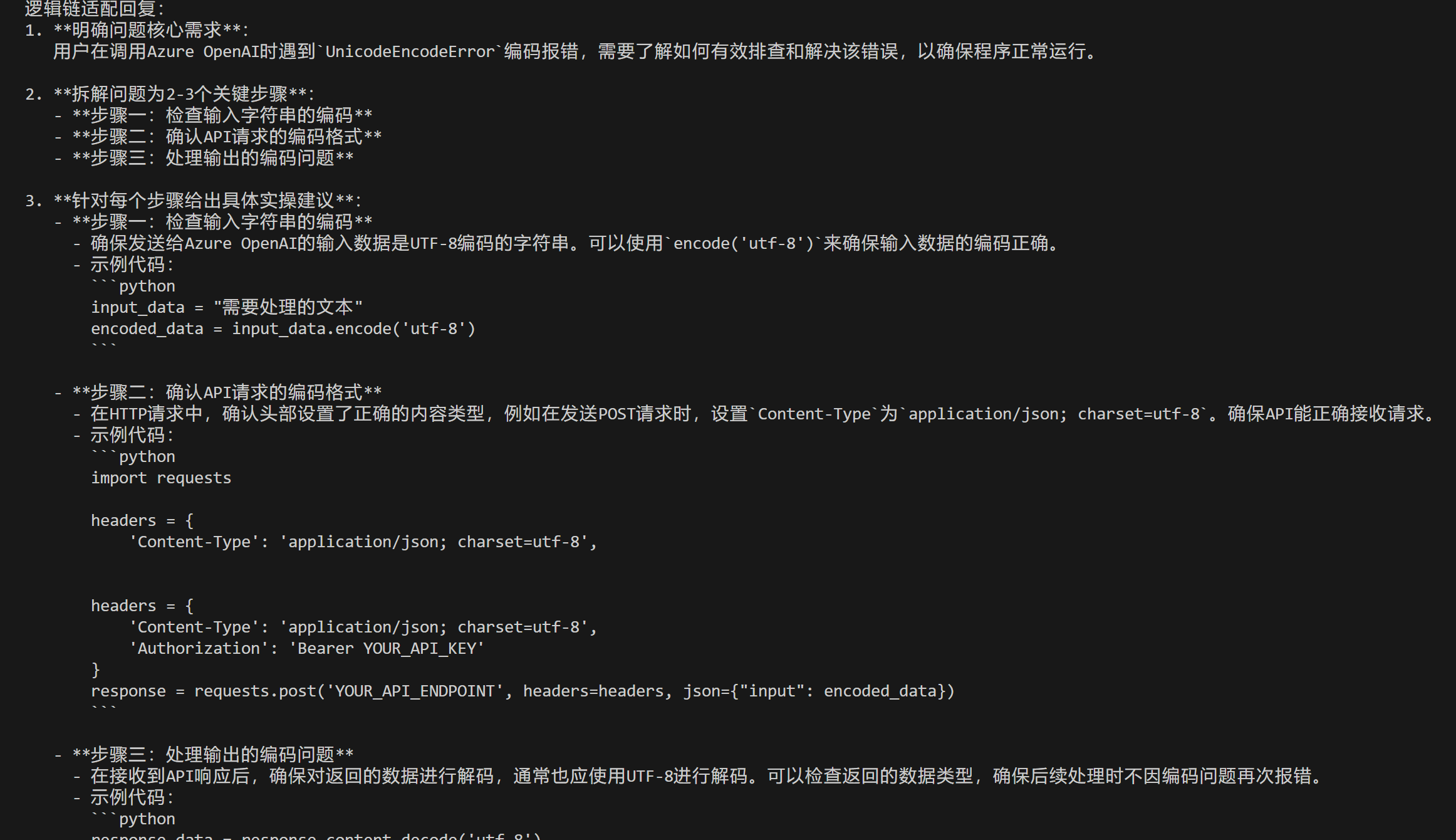 遇到复杂问题时,比如"如何排查Azure OpenAI调用报错""提示工程优化的完整流程",模型很容易出现答不全、逻辑混乱的情况。这时用逻辑链提示,让模型按步骤思考、按逻辑输出,从而解决实际问题。