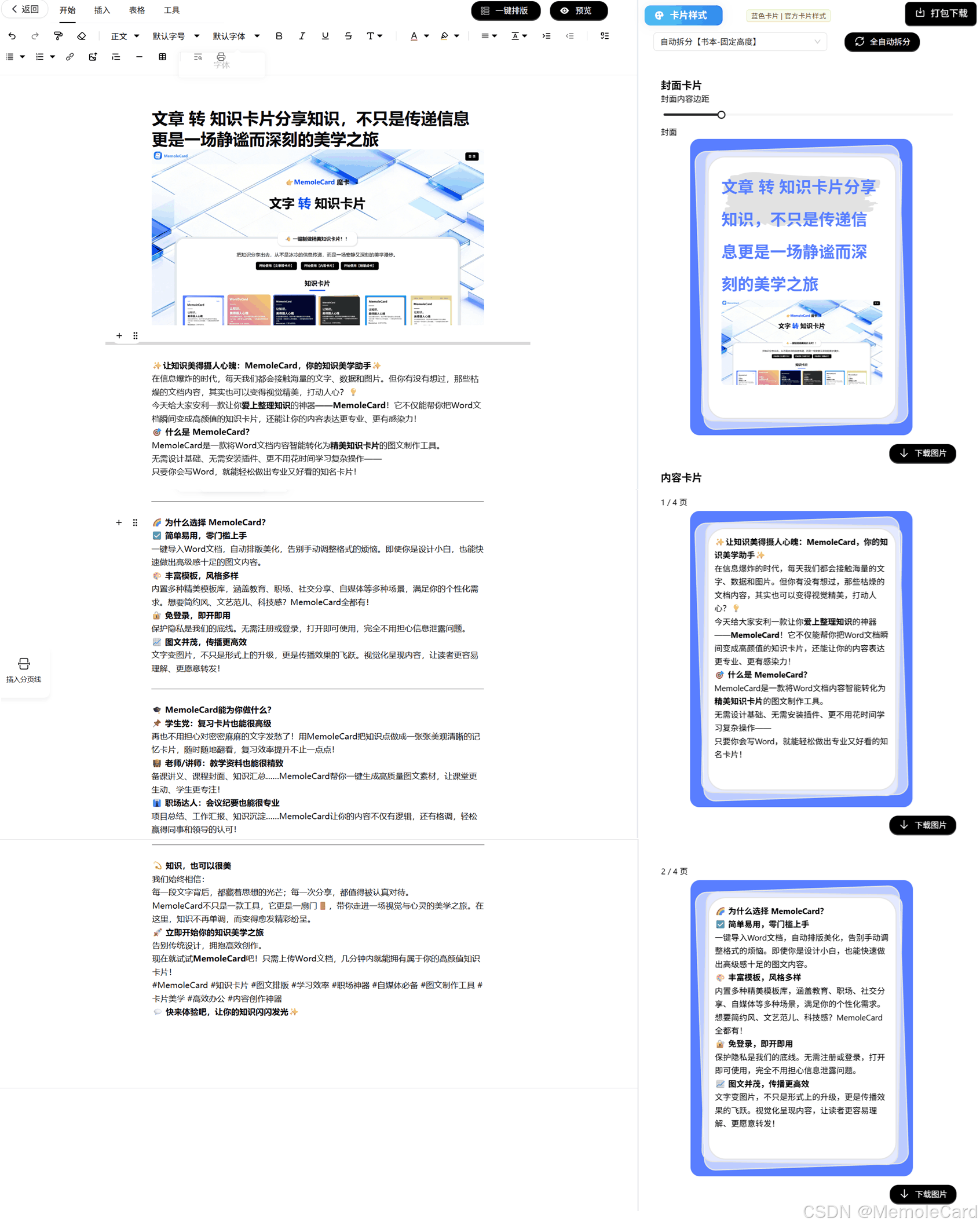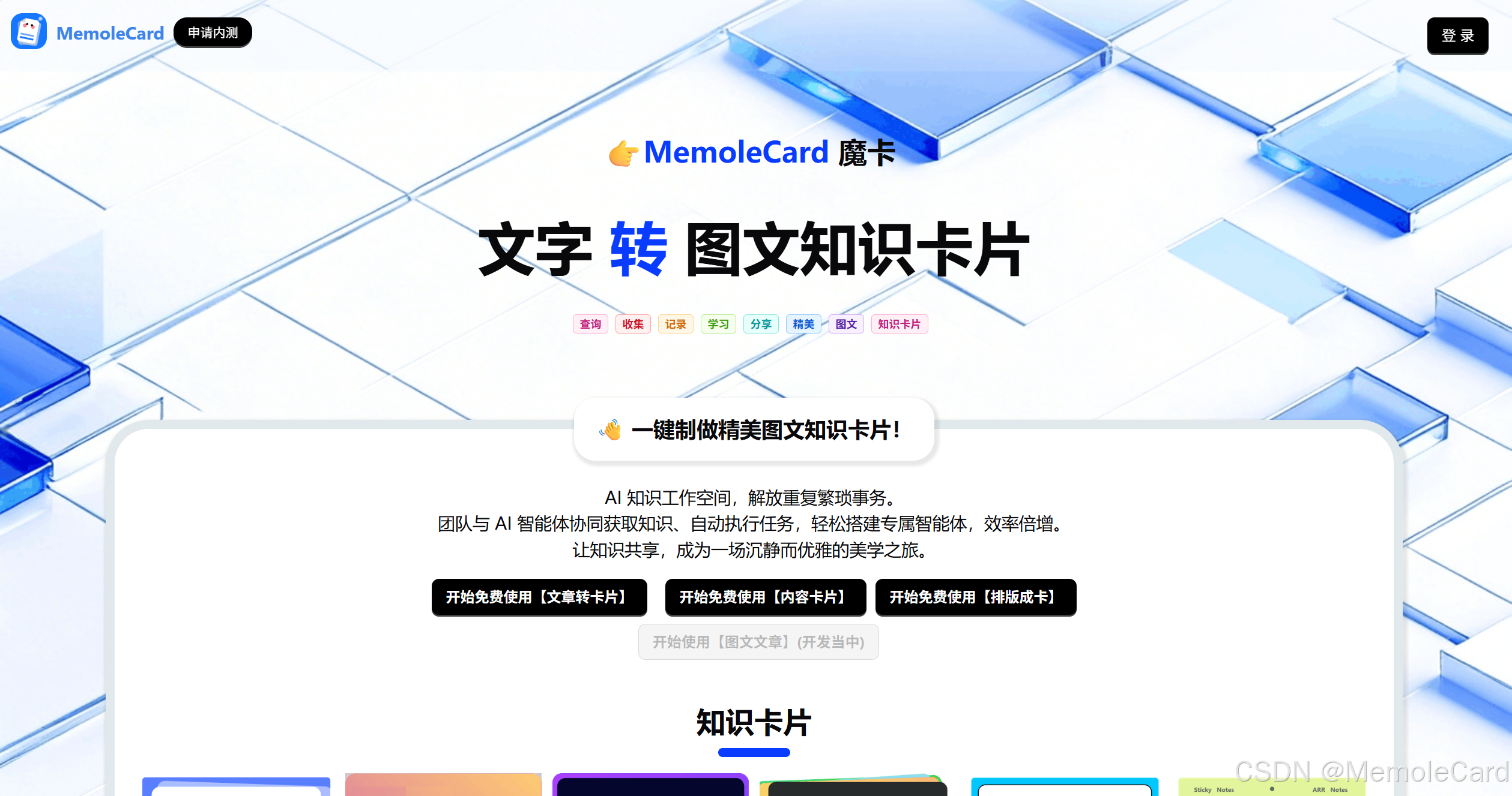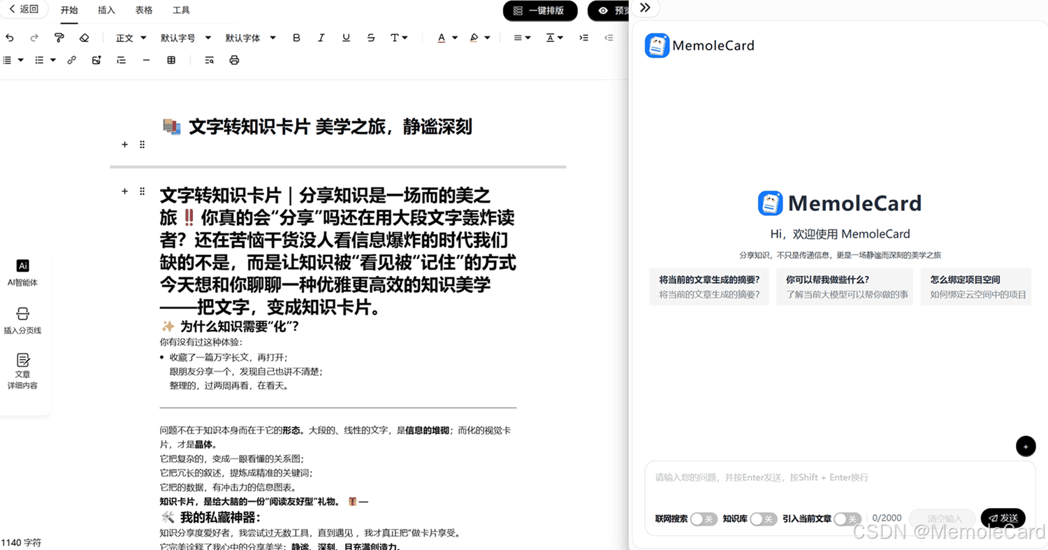 在信息爆炸的时代,我们每天被海量文字包围,无论是学习中的知识点、工作里的核心信息,还是需要沉淀的碎片化内容,如何高效整理、便捷记录、优雅分享,成为许多人面临的难题。MemoleCard魔卡(以下简称"魔卡")应运而生,以"文字转图文知识卡片"为核心,打造一站式AI知识工作空间,打破传统知识管理的繁琐壁垒,让知识的查询、收集、记录、学习与分享,都成为一场沉静而优雅的美学之旅。