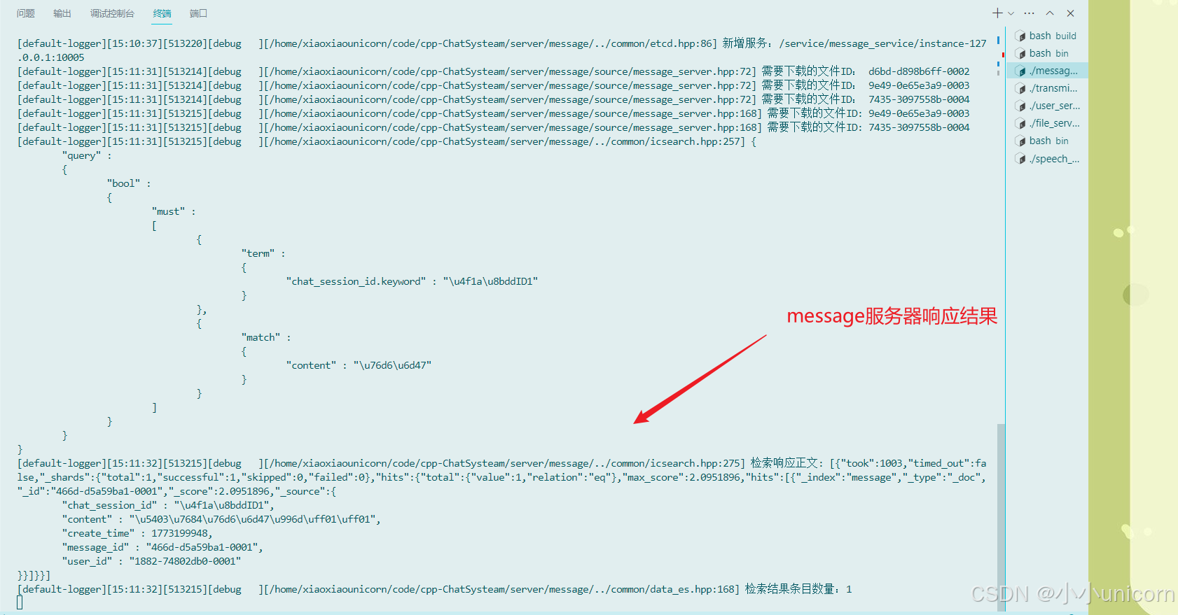 b. 连接用户管理子服务:在消息搜索时,根据发送用户的ID获取发送者用户信息 ES客户端模块:基于elasticsearch框架实现访问客户端,向es服务器进行文本聊天消息的存储,以便于文本消息的关键字搜索。MQ消费模块:基于rabbitmq-client封装的消费者模块从消息队列服务器消费获取聊天消息,将文本消息存储到ElasticSearch服务,将文件消息转储到文件管理子服务,所有消息的简息都需要向数据库存储一份。