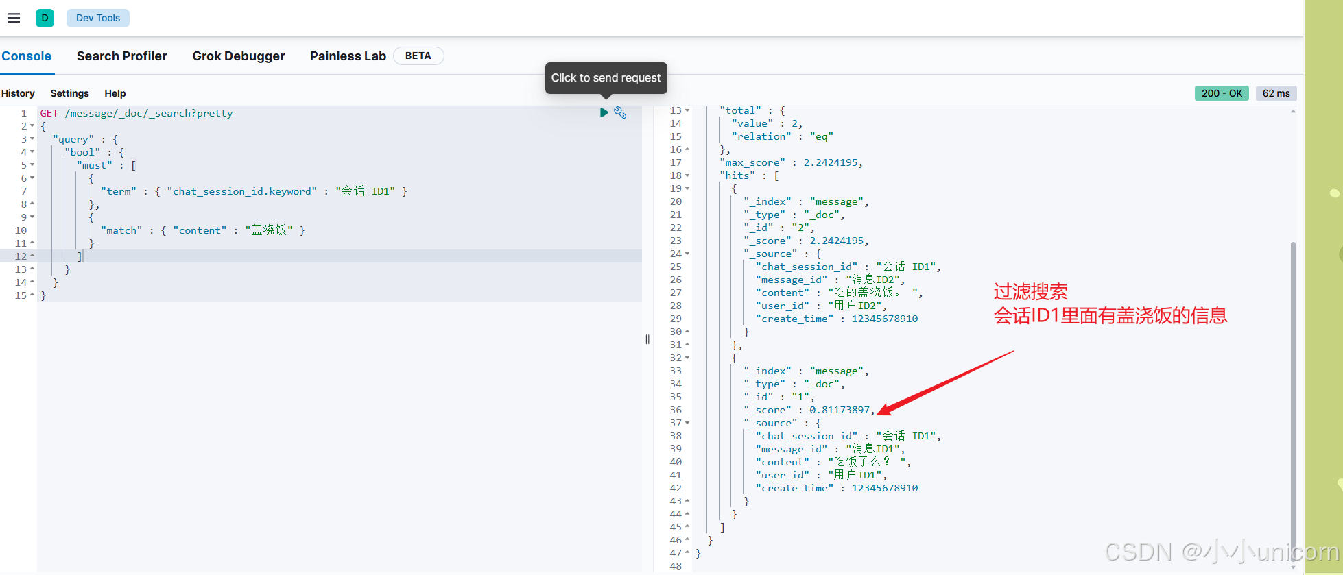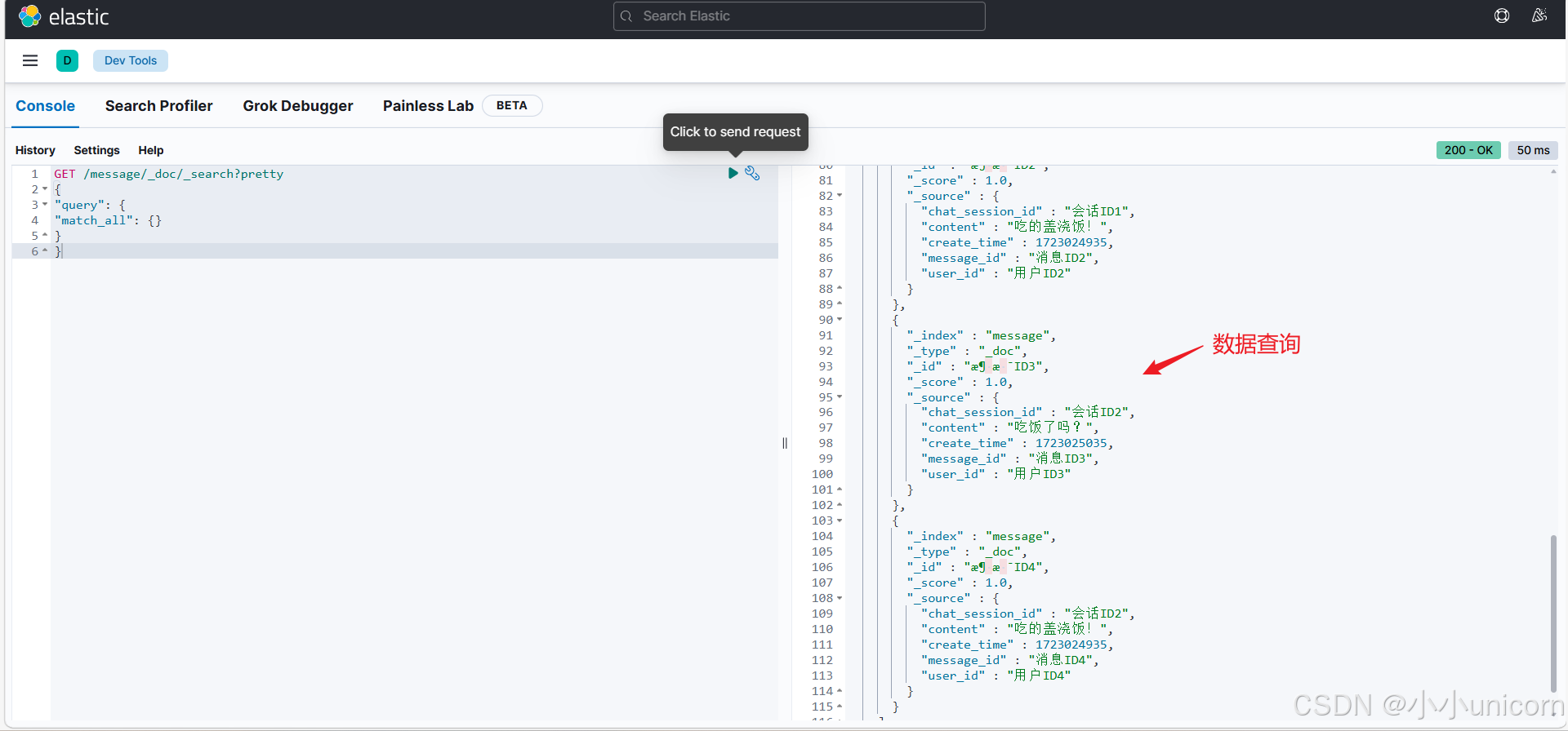 ES 客户端,访问ES 服务器进行文本消息搜索(以消息内容进行搜索,以会话ID 进行过滤),从 ES 服务器获取到消息简息(消息 ID,会话 ID, 文本消息内容)。 - 循环从数据库根据消息