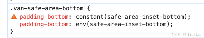 项目里使用的是 van-action-sheet 组件,通过 chrome://inspect 调试页面,在 DevTools 中检查样式,发现 padding-bottom: env(safe-area-inset-bottom); 是生效的, padding-bottom 的值不是 0。