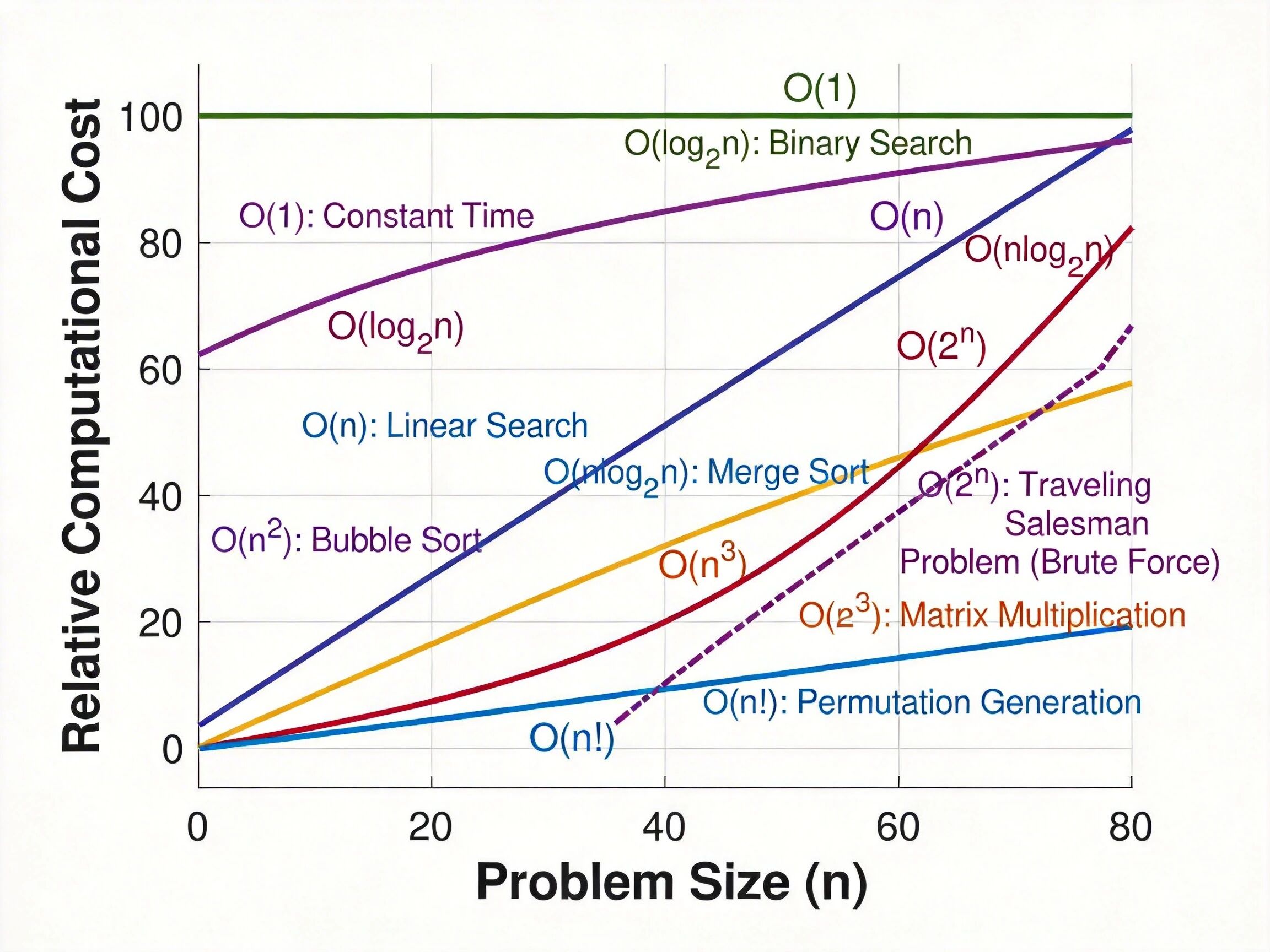 常见时间复杂度增长率对比曲线图,标注各复杂度对应的典型算法