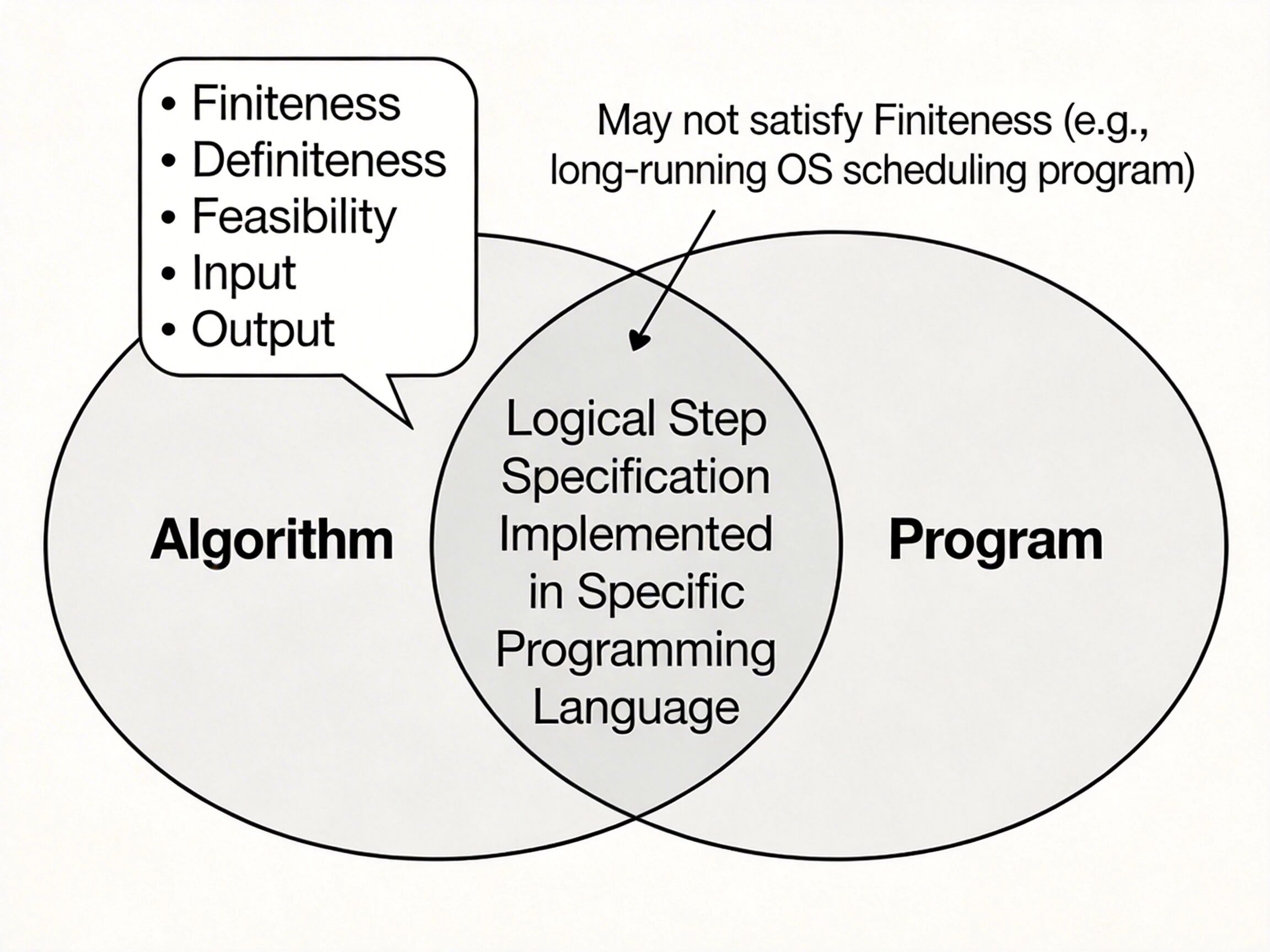 算法与程序的关系示意图,标注五大特性的位置及约束边界