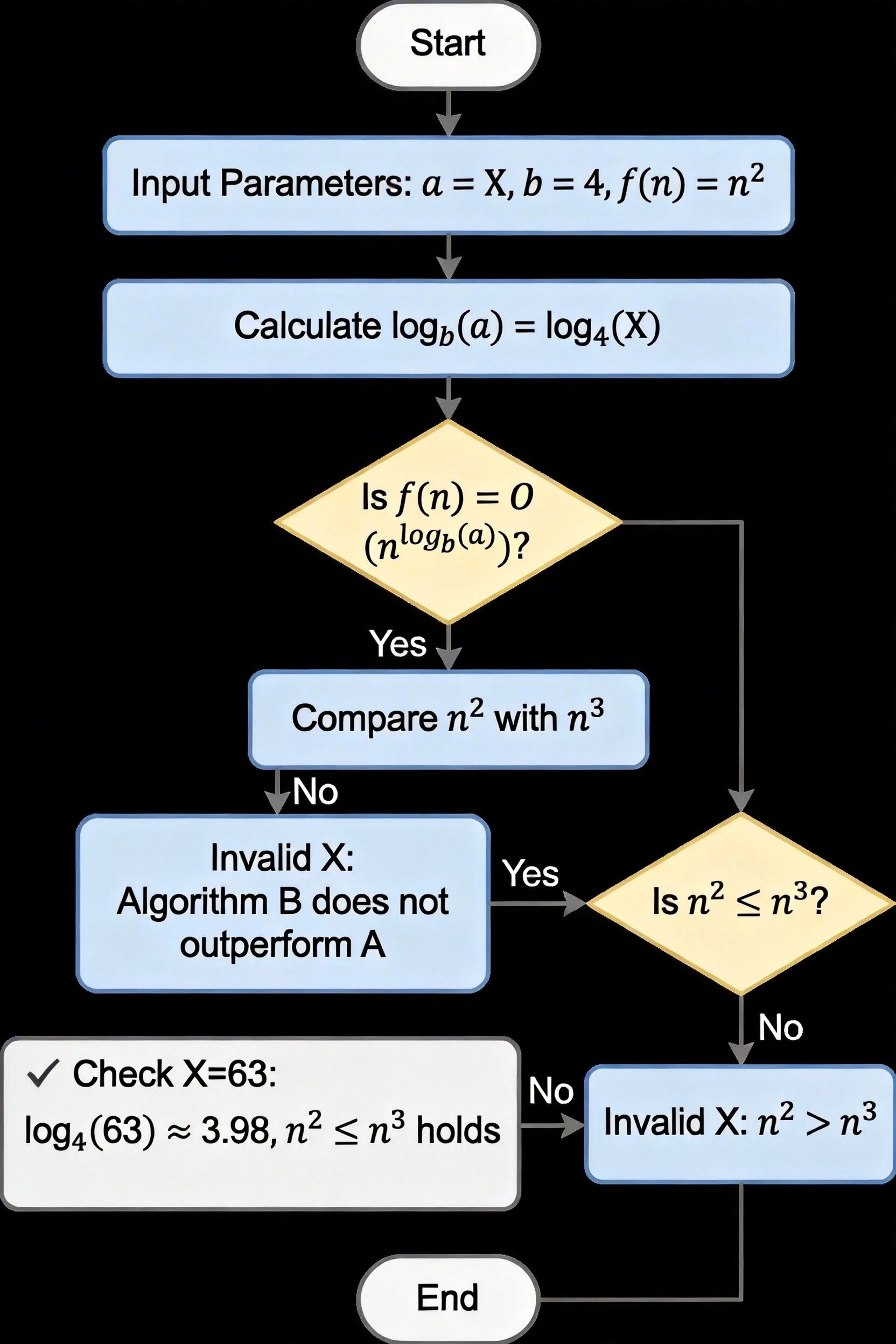 案例:已知两个算法 A 和 B,算法 A 的时间复杂度为 T_A (n)=O (n³),算法 B 的递归式为 T_B (n)=X×T (n/4)+n²,求 X 的最大取值使得算法 B 的时间复杂度优于 A。
